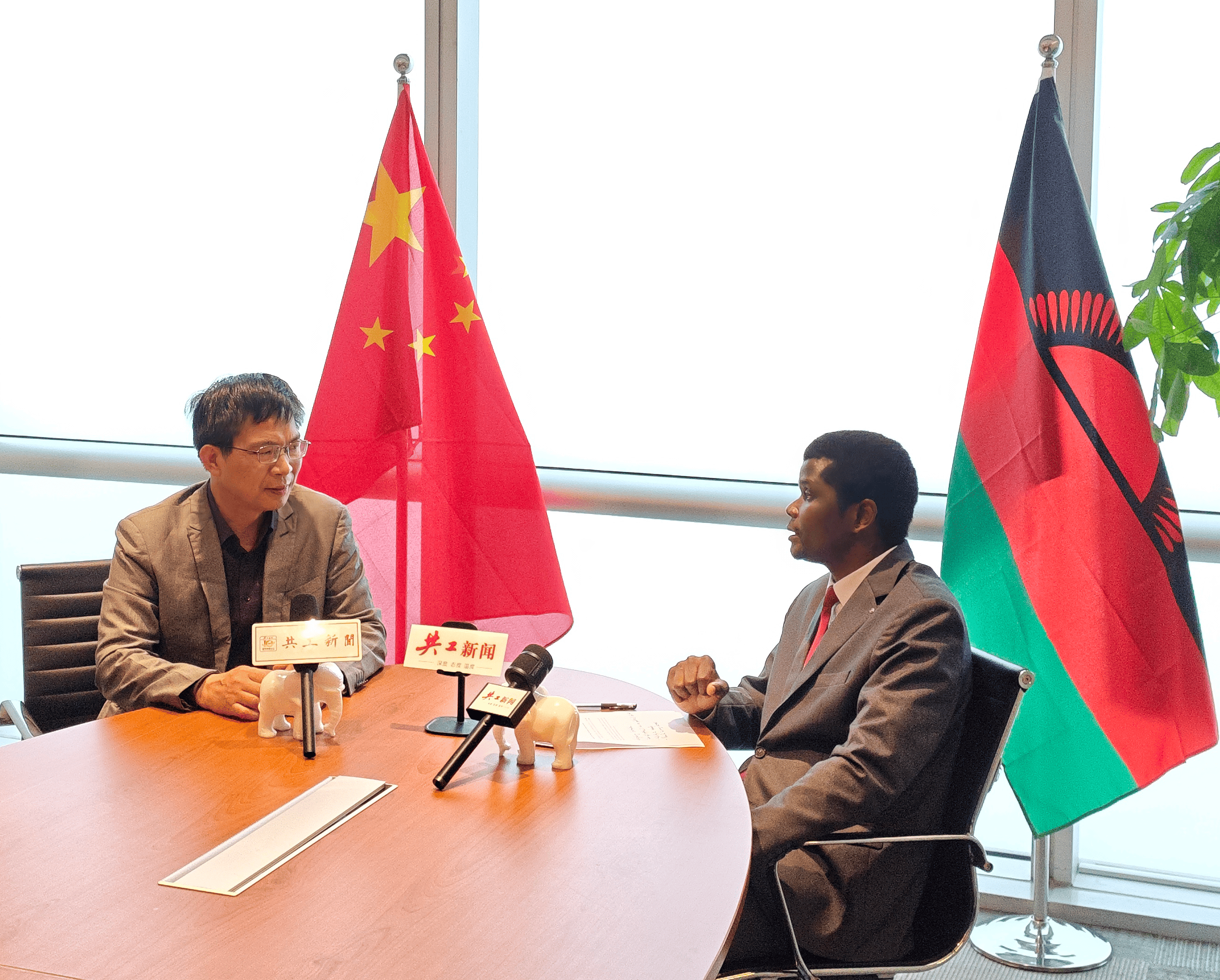 图说:共工新闻社总编辑办公室副主任、记者廖红麟正在专访马拉维共和国2030年总统候选人、“人民革命党”领袖贾尼·格雷·卡苏达(共工社记者 廖静文 摄)